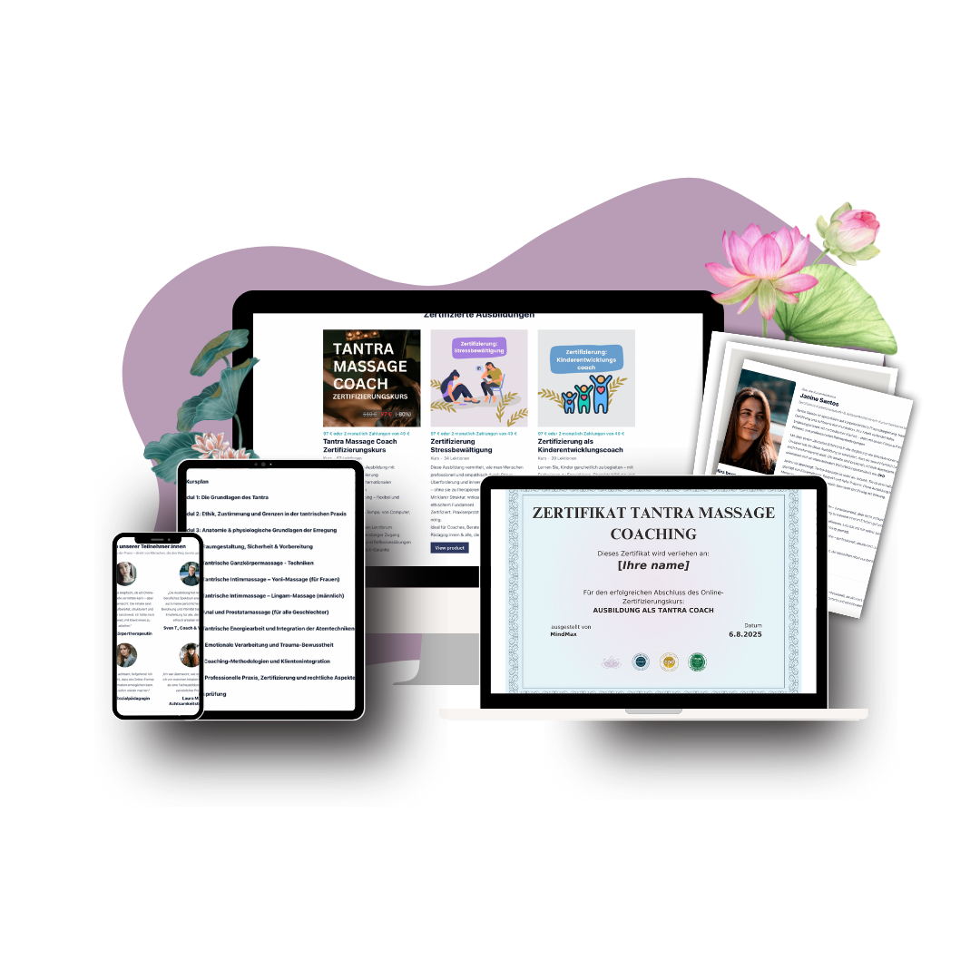 Nach erfolgreichem Abschluss erhalten Sie ein personalisiertes Zertifikat als Tantra Massage Coach, das Sie in Coaching, Körperarbeit oder Präventionspraxis einsetzen können – weltweit gültig.
